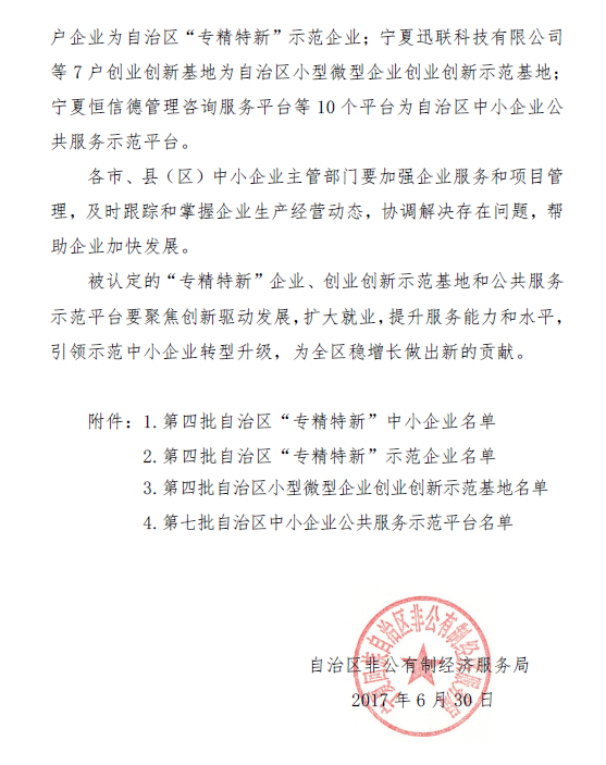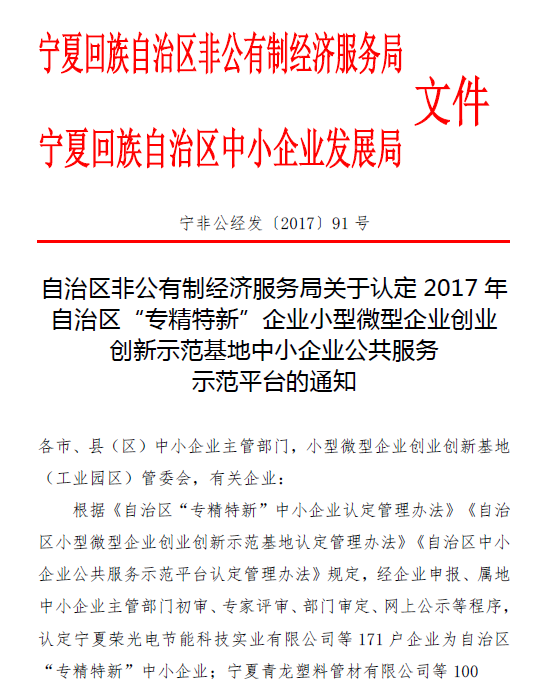 我公司被自治區(qū)非公有制經(jīng)濟(jì)服務(wù)局認(rèn)定為“第七批自治區(qū)中小企業(yè)公共服務(wù)示范平臺(tái)單位” |