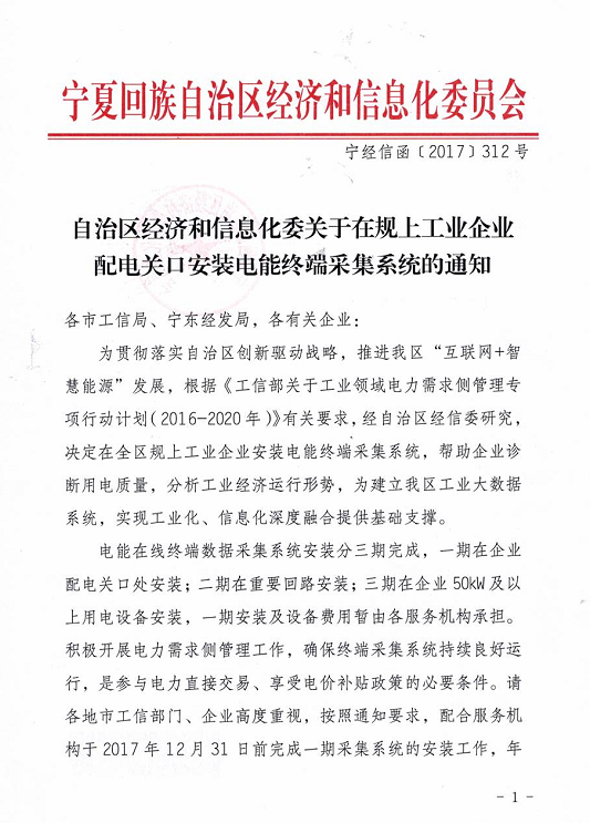 關(guān)于轉(zhuǎn)發(fā)《自治區(qū)經(jīng)濟(jì)和信息化委關(guān)于在規(guī)上工業(yè)企業(yè)配電關(guān)口安裝電能終端采集系統(tǒng)的通知》 |