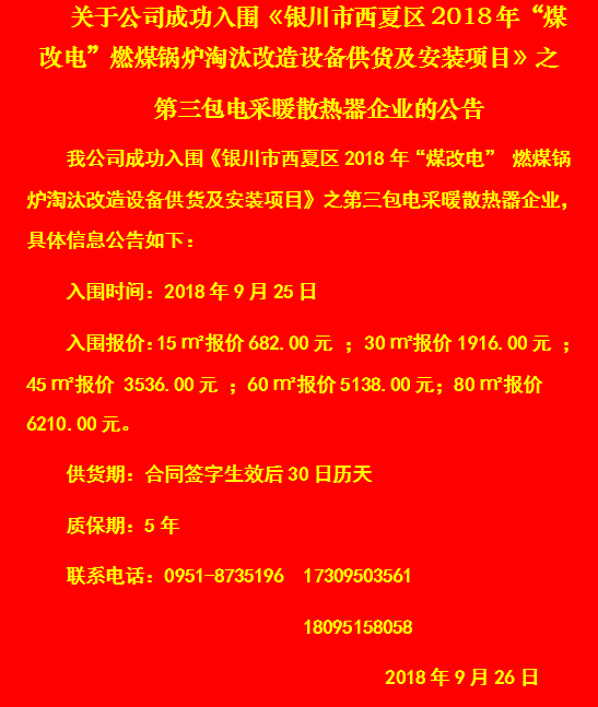 關(guān)于公司成功入圍《銀川市西夏區(qū)2018年“煤改電”燃煤鍋爐淘汰改造設(shè)備供貨及安裝項目》之第三包電采暖散熱器企業(yè)的公告 |